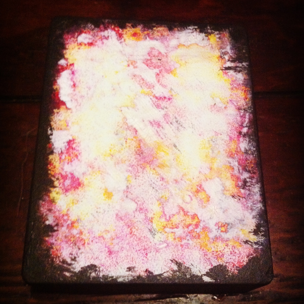 I tried for over an hour to get this thing right. I painted over about 5 attempts. Eventually after much frustration I gave up and began to rub it off with a sponge – exposing the layers underneath and producing the most glorious effect. Very happy accident!!